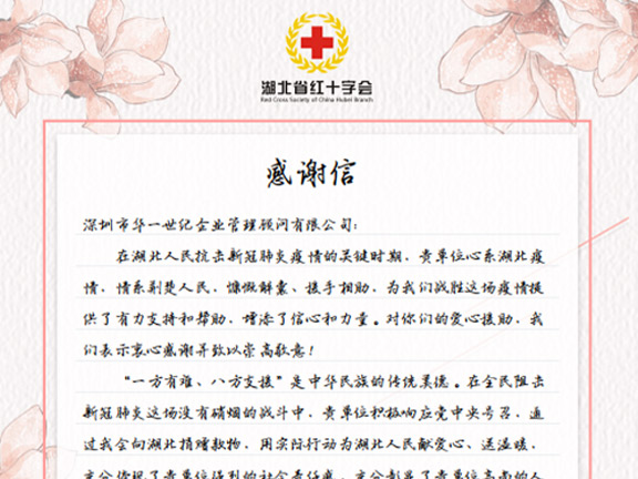 武汉出现新冠疫情以来,华一世纪董事会领导和全体家人高度重视,单海洋多次安排部署,并在湖北省公布官方捐助账号之后,即刻行动将第一笔捐助款项20万汇入湖北省红十字会,用于湖北疫情防控。